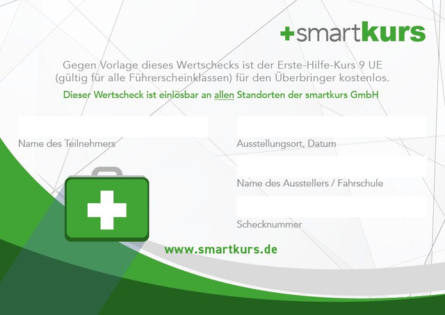 Hier kannst Du einen Gutschein ( Wertscheck) für die Teilnahme an einem unserer amtlich anerkannten Erste Hilfe Kurse erwerben.